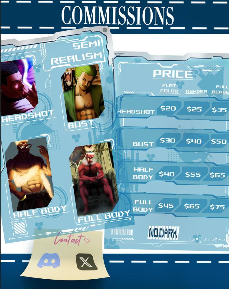 There is an additional 50% charge based on the style and/or body division, per character featured in the scene.